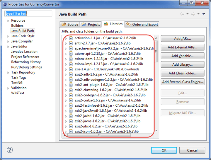 Step f) Add all the axis2 related jars to project build path, which will be there in lib folder of the axis2 software folder