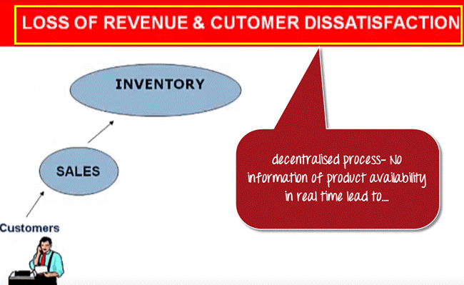 Since it is a decentralized process, the Sales Team do not have any real-time information access to the productavailability. So they approach the Inventory department to check the availability of the product. This process takes time, and the customer chooses another vendor leading to loss of revenue and customer dissatisfaction.