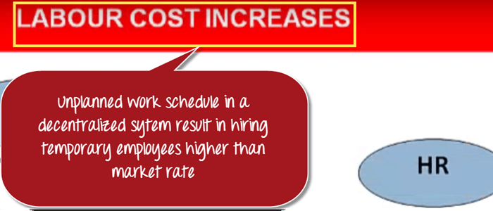 Once the raw material is available, the shop floor department suddenly realizes they are short of workers. They approach the HR, who in turn hire temporary employees at higher than market rates. Thus LABOR Cost Increases.