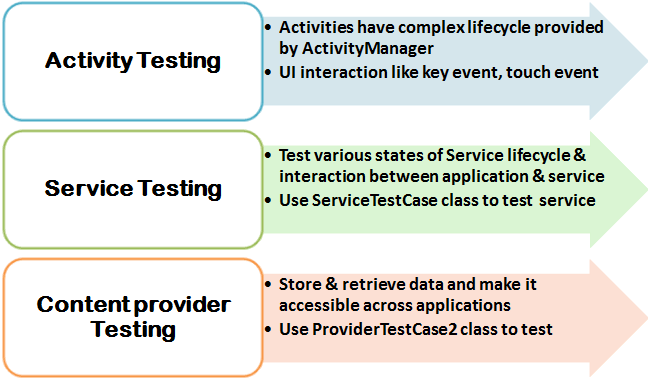 In the above list, Performance Testing is given more focus. You can use tools like Traceview to conduct performance test on Android .This tool can help you debug your application and profile its performance.