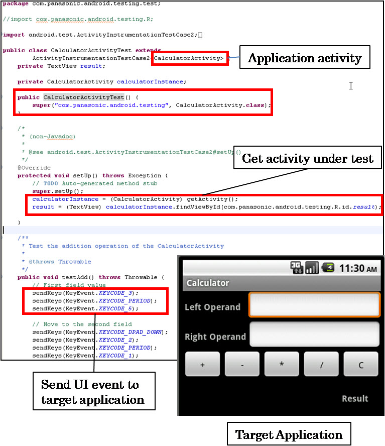 Below is an example of ActivityInstrumentationTestCase. It verifies the UI operation of Calculator application, check the correctness of the UI outputs.