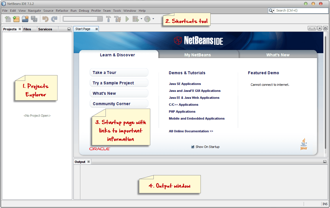 3. Startup page – this page contains 3 tabs namely- Learn & Discover, My Netbeans and What’s New.