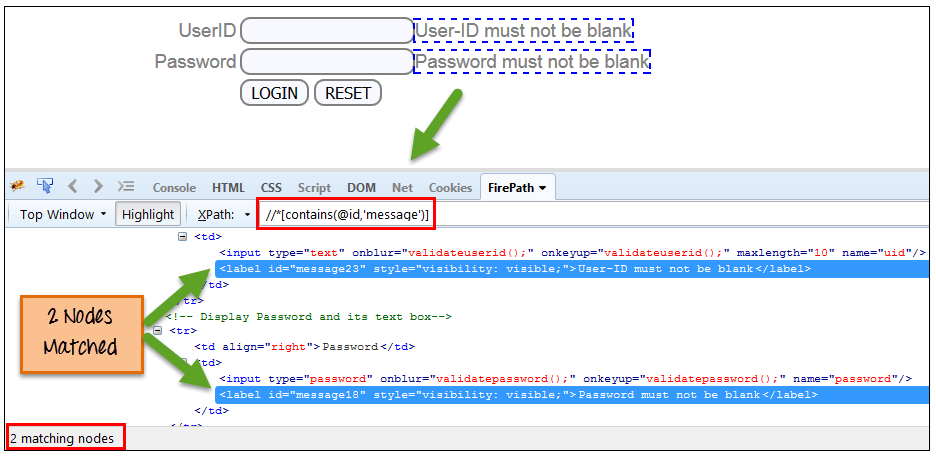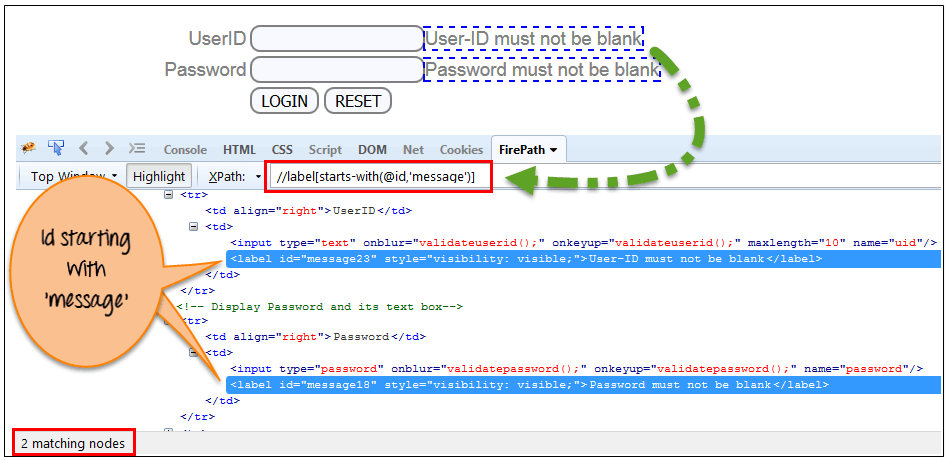 In the below expression, there are two elements with an id starting "message"(i.e., 'User-ID must not be blank' & 'Password must not be blank'). In below example, XPath finds those element whose 'ID' starting with 'message'.