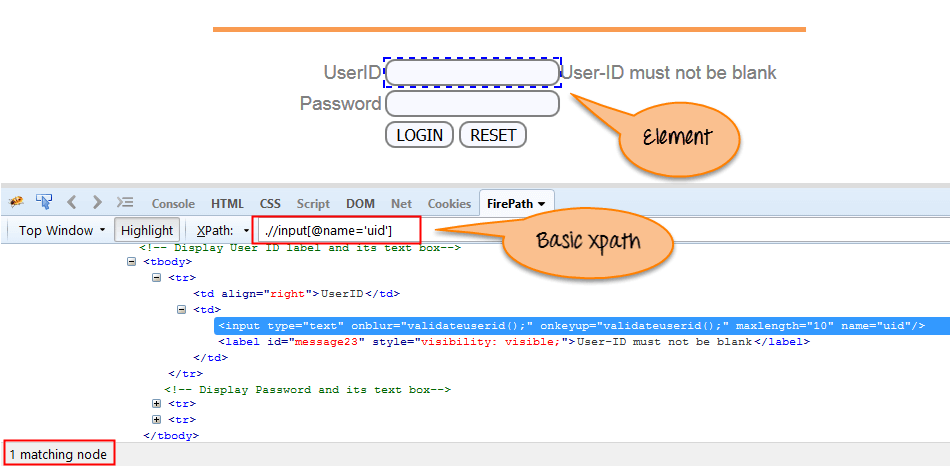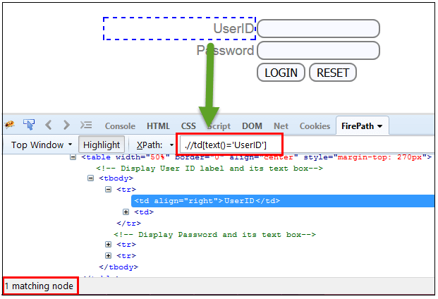 In this expression, with text function, we find the element with exact text match as shown below. In our case, we find the element with text "UserID".