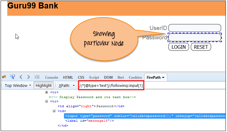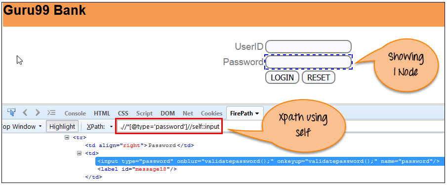 With the input as '1', the below screen shot finds the particular node that is 'Password' input box element.