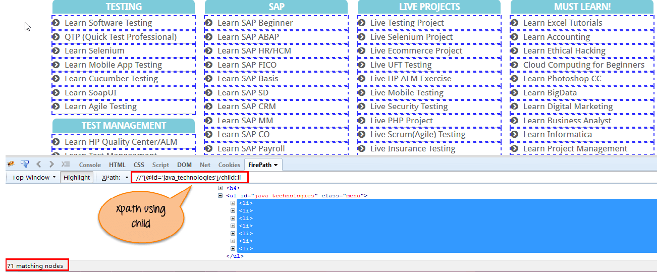 There are 71 "li" nodes matching by using "child" axis. If you want to focus on any particular element then you can use the below xpath: