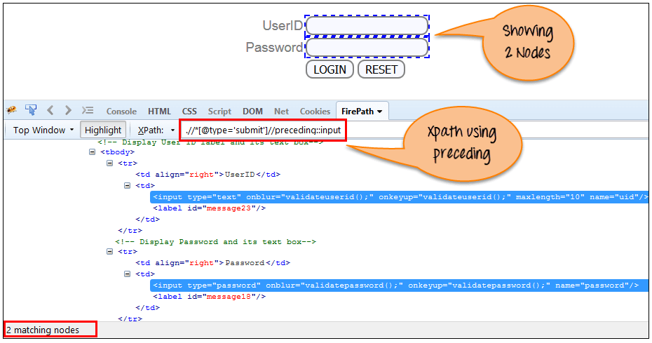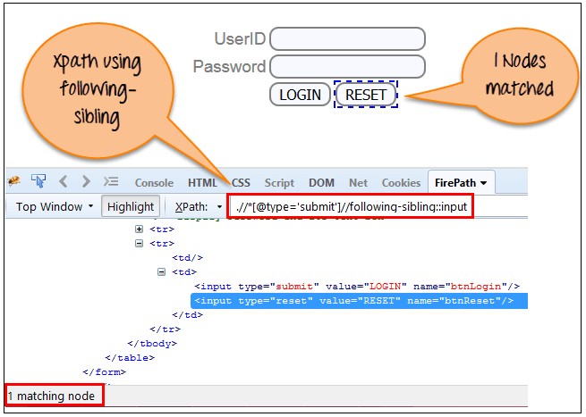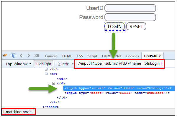 Highlighting both elements as "LOGIN " element having attribute 'type' and "RESET" element having attribute 'name'.