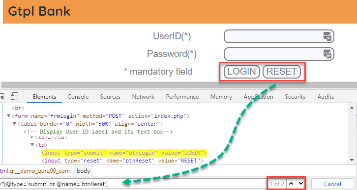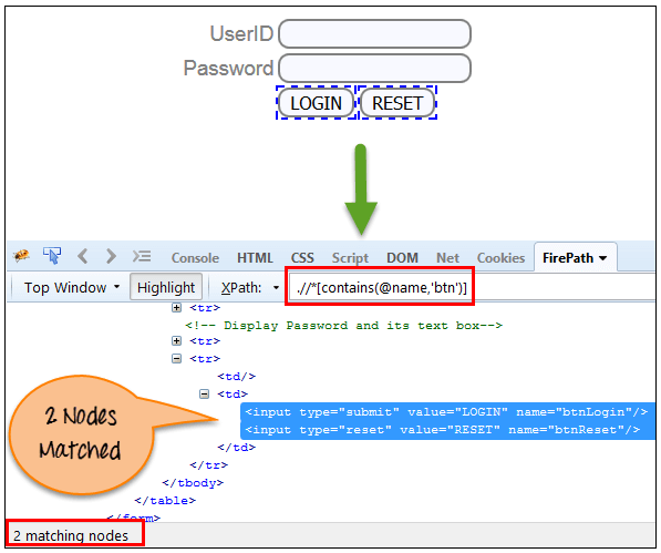 In the above expression, we have taken the 'name' as an attribute and 'btn' as an partial value as shown in the below screenshot. This will find 2 elements (LOGIN & RESET) as their 'name' attribute begins with 'btn'.
