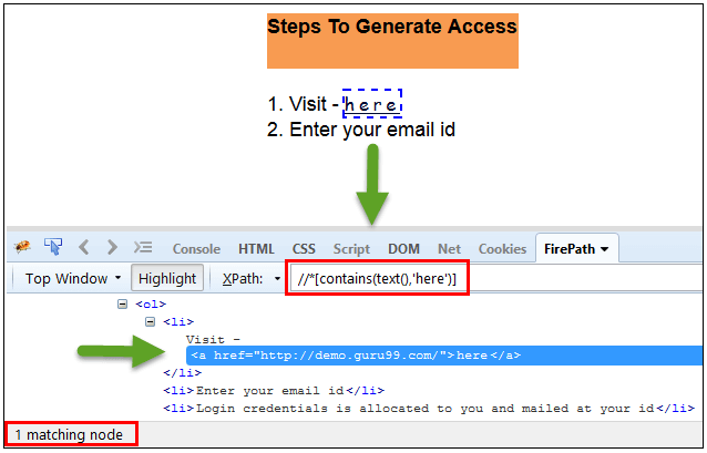 In the below expression, we have taken the "text" of the link as an attribute and 'here' as a partial value as shown in the below screenshot. This will find the link ('here') as it displays the text 'here'.