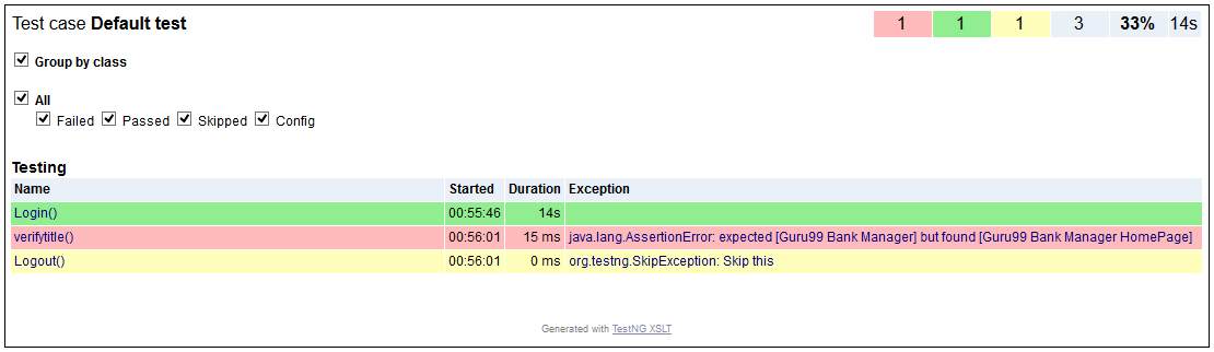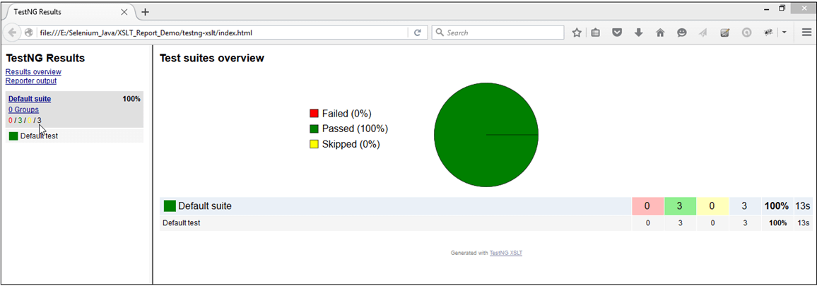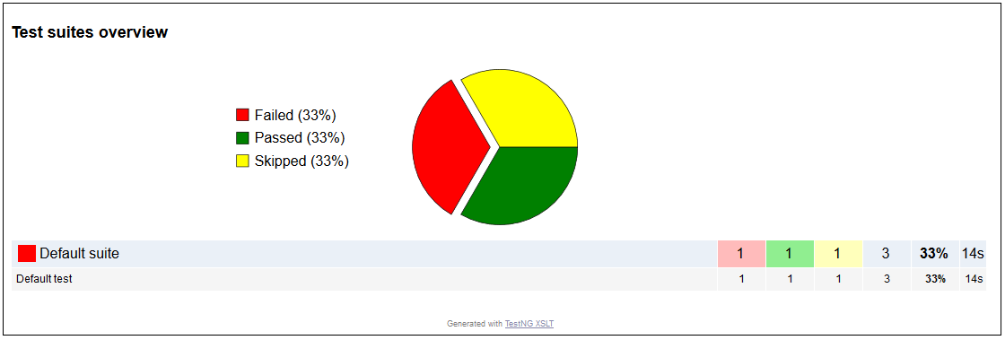 By doing so, we are trying to show XSLT report with the help of pie chart. It will show the test result for a pass, fail and skip test.