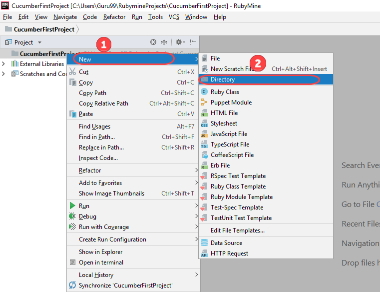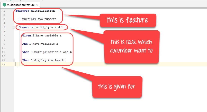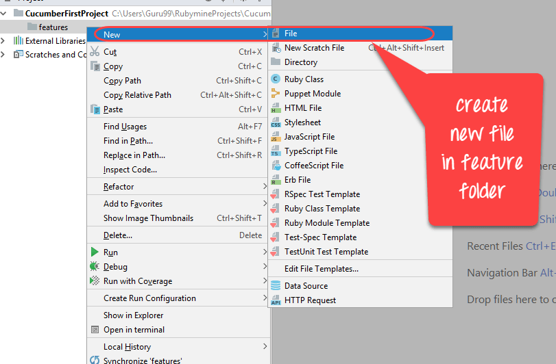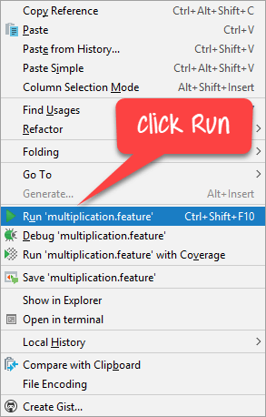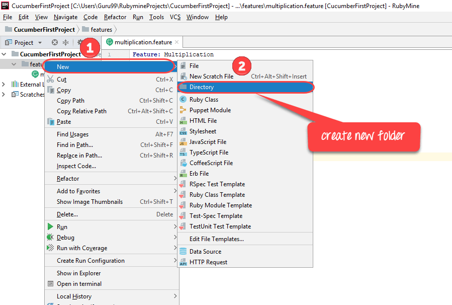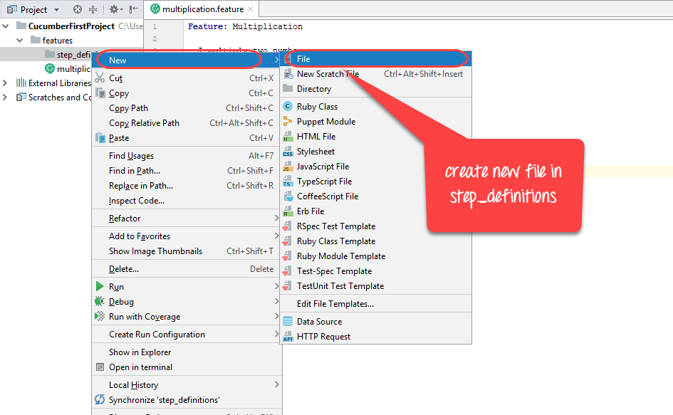 Step 6) Create and Save File in "yourfolder/features/" with name "yourfilename.feature"